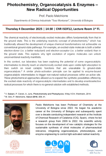 On Thursday 4th December 2025, Prof. Paolo Melchiorre, Dipartimento di Chimica Industriale "Toso Montanari", Alma Mater Studiorum - Università di Bologna, will present a lecture in the frame of the CLAN seminars series.