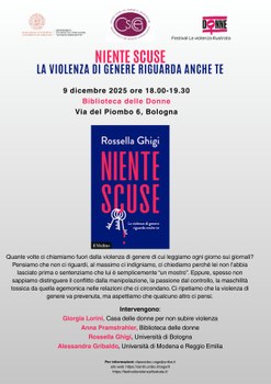 Nell'ambito del "Festival della violenza illustrata", presentazione del volume: La violenza nelle relazioni intime. La trasmissione intergenerazionale degli abusi contro le donne, di Federica Santangelo. Incontro organizzato da Casa delle donne per non subire violenza e CSGE. Relatrici: Gabriella Brascaglia, Rossella Ghigi, Federica Santangelo. Evento curato da Alessandra Gribaldo. Data e luogo: 12 dicembre 2018, Libreria Ubik, v. Irnerio 27, Bologna.