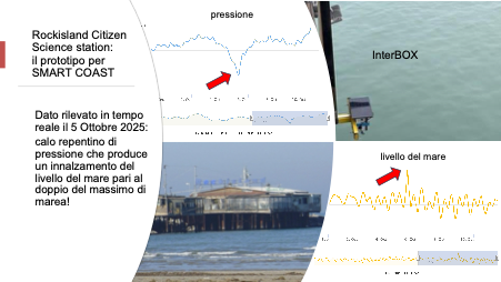 Quel giorno le spiagge di Rimini sono state allagate in modo inaspettato. Ma cosa ha causato questo evento? Ce lo spiega la stazione meteo-marina installata al Rockisland, sul molo di Rimini, grazie al progetto delle stazioni della Scienza dei Cittadini. Questa stazione, che misura in tempo reale il livello del mare e la pressione atmosferica, ha registrato un improvviso calo di pressione. Dopo alcune ore, questo cambiamento ha causato un innalzamento del livello del mare fino al doppio rispetto a quello previsto con la normale marea.