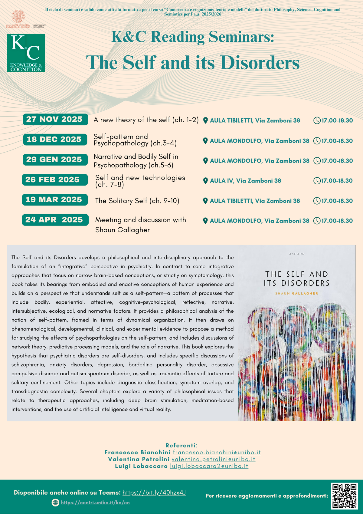Programme: This year, the series will revolve around a recently published book, The Self and Its Disorders (Oxford University Press, 2024) by Shaun Gallagher. The book aims to redefine the problem of subjectivity through a new interdisciplinary approach. It shows the implications of this theoretical proposal for understanding phenomena such as psychopathologies, new technologies, and practices like mindfulness and confinement. Each meeting will feature the presentation of two chapters of the book by a young researcher from the Department of Philosophy, followed by an open discussion. At the end of the collective reading and critical reflection, a final event will be held: a discussion of the book with its author.