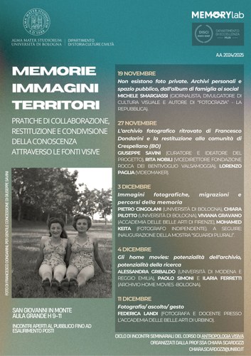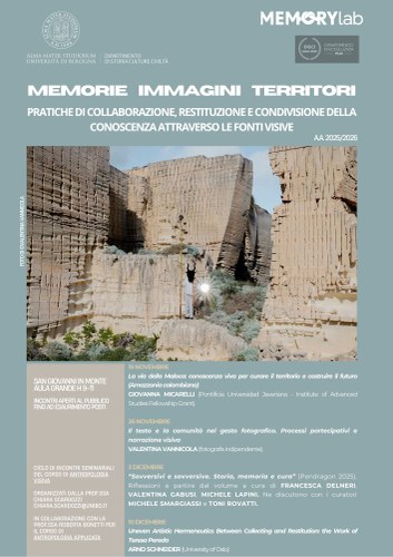 In a contemporaneity characterized by the dematerialization and overcrowding of images, created and enjoyed in an immediate way, mainly through digital tools and environments, what social role do images of the past play?The seminars, multidisciplinary in nature, will aim to present different experiences and case studies to investigate the multiple ways images (photographic and filmic, amateur or auteur) have to contribute to research in collaboration with the communities involved, and in what ways they can be valorized, reread, reinterpreted, produced and shared for the creation of knowledge and the activation of collective histories and memories.