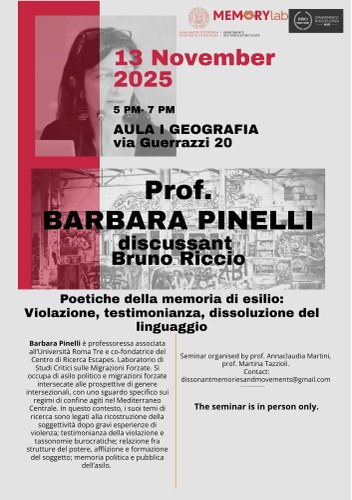 Barbara Pinelli è Professoressa Associata all'Università Roma Tre e co-fondatrice del Centro di Ricerca Escapes. Laboratorio di Studi Critici sulle Migrazioni Forzate. Si occupa di asilo politico e migrazioni forzate intersecate alle prospettive di genere intersezionali, con uno sguardo specifico sui regimi di confine agiti nel Mediterraneo Centrale. In questo contesto, i suoi temi di ricerca sono legati alla ricostruzione della soggettività dopo gravi esperienze di violenza; testimonianza della violazione e tassonomie burocratiche; relazione fra strutture del potere, afflizione e formazione del soggetto; memoria politica e pubblica dell'asilo.