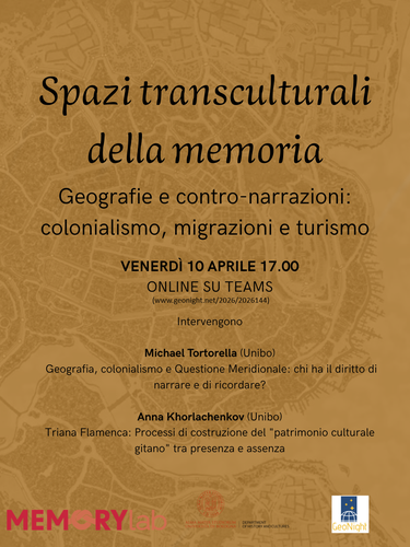 Il MemoryLab partecipa ala GeoNIght 2026 promuovendo l'evento "Transcultural Spaces of Memory": questa discussione guidata dai ricercatori metterà in primo piano le pratiche di memorializzazione di tipo top-down rispetto a quelle bottom-up in diversi contesti. Si presterà particolare attenzione a una serie di metodi volti a comprendere la polivalenza dei processi di costruzione dell'identità, con particolare riferimento ai luoghi di incontro interculturale e di resistenza individuati durante il lavoro sul campo. Si prenderanno in esame aspetti quali la geopolitica, il patrimonio culturale, i gruppi di appartenenza e quelli estranei, la mobilità, il turismo e la vulnerabilità a diversi livelli.
