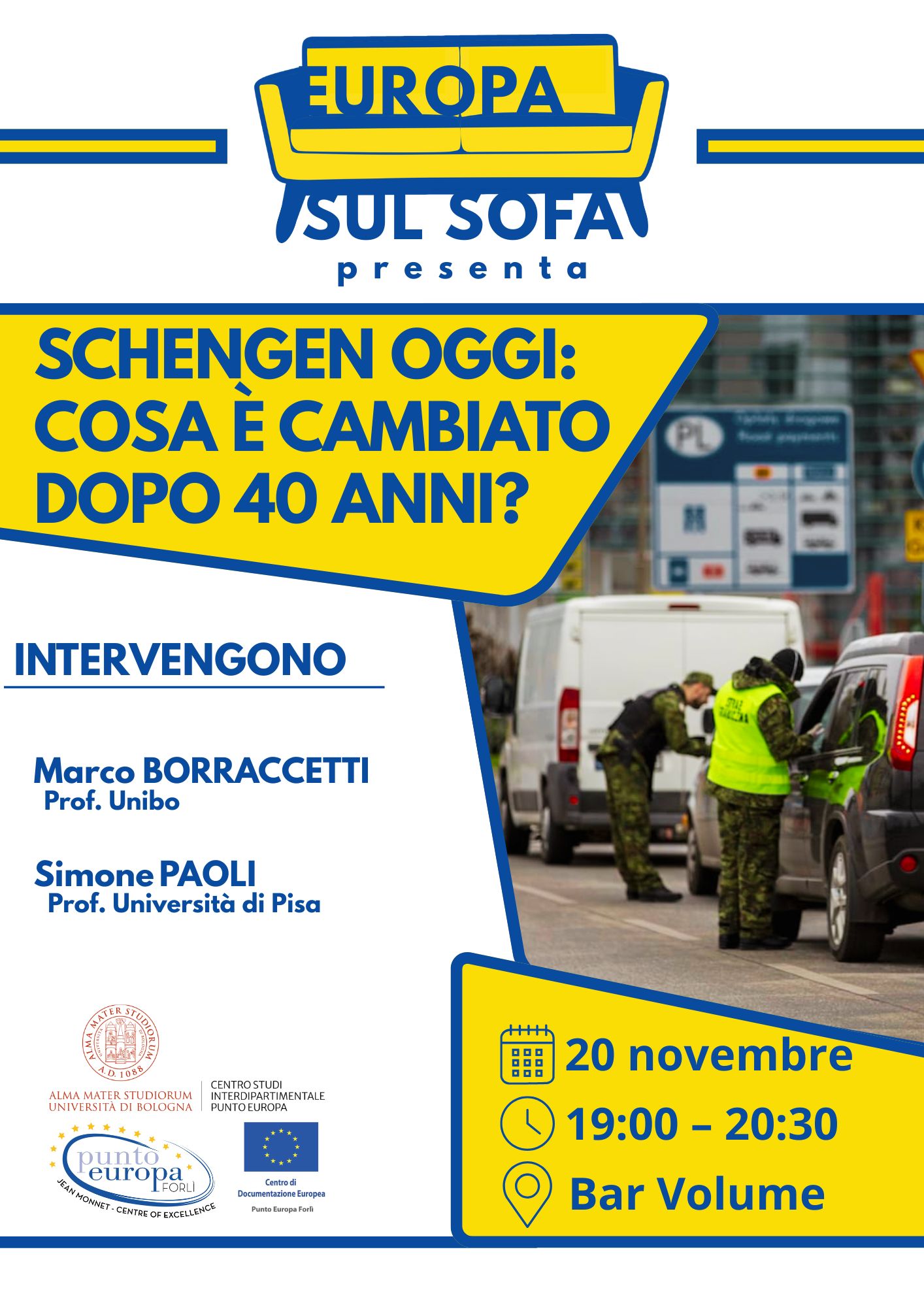 Sono trascorsi 40 anni dalla firma del Trattato di Schengen, l'accordo che istituì la libera circolazione delle persone tra i Paesi firmatari. In occasione del terzo incontro del ciclo Europa sul sofà, Marco Borraccetti (Università di Bologna, Campus di Forlì) e Simone Paoli (Università di Pisa) discuteranno l'evoluzione, le criticità e le ambiguità che hanno caratterizzato il processo, tanto affascinante quanto complesso, di rimozione dei controlli alle frontiere interne e del rafforzamento dei controlli alle frontiere esterne.